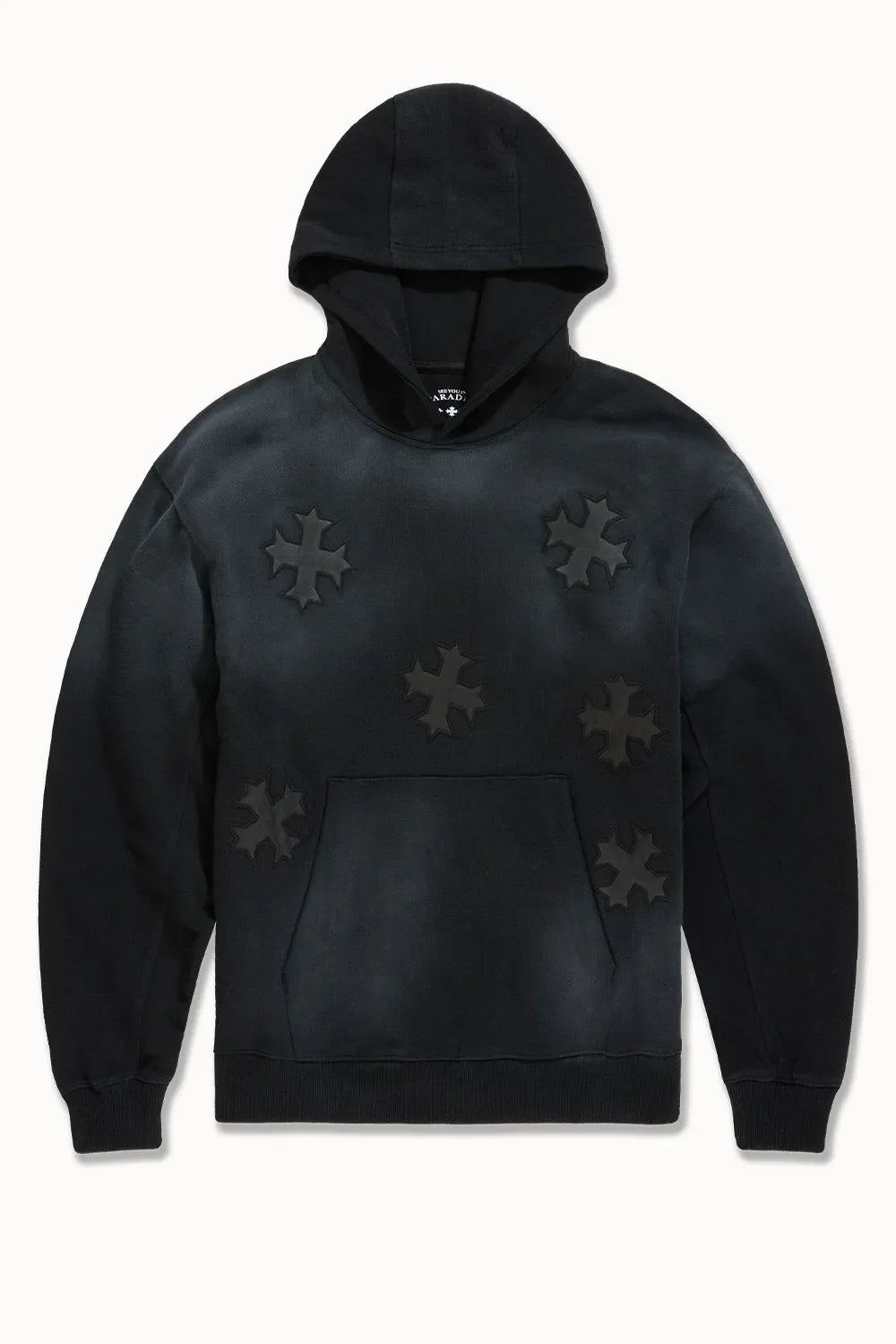 Men's pullover hoodie with drawstring hood and custom patchwork design. Features kangaroo pocket and ribbed cuffs. Made from 100% cotton French Terry (500 GSM). Color: Black Shadow. Style: 9118H-BS.
