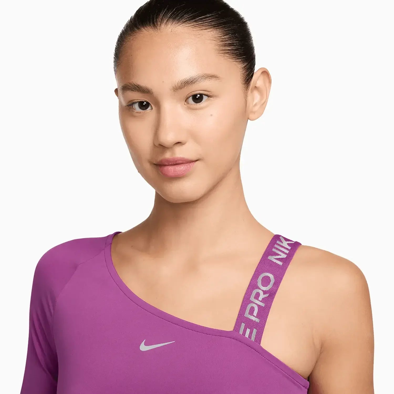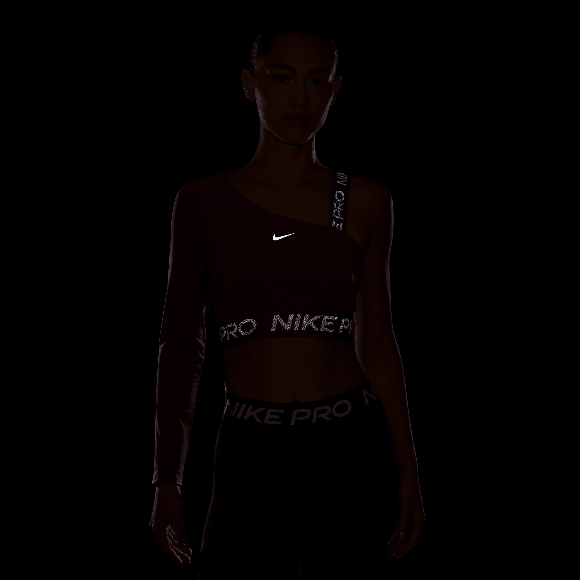 Push yourself to feel bold in this asymmetrical Nike Pro top. Lightweight and stretchy, the smooth fabric dries quickly to help you stay cool, while reflective graphics brighten up your workout.