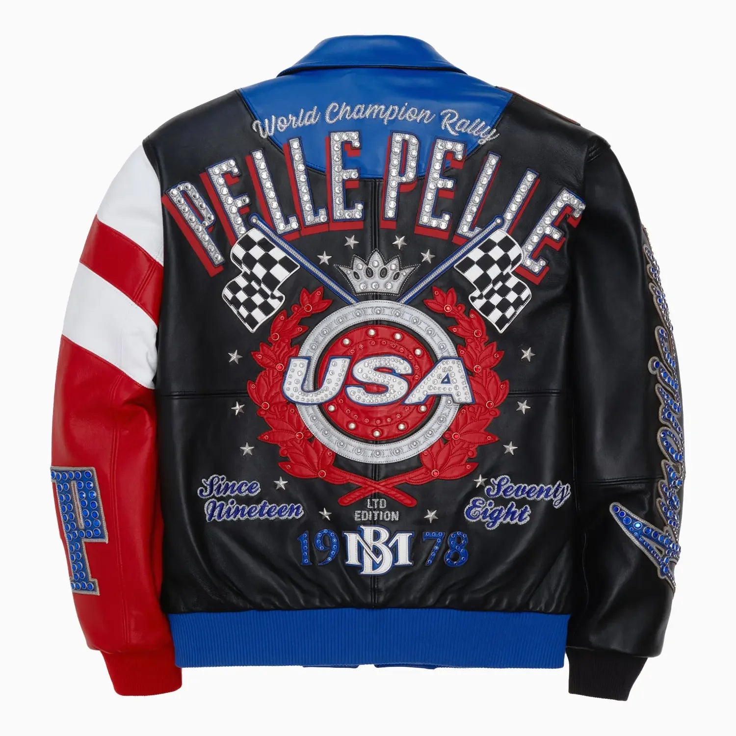 - Oversize pelle pelle checkered flag race graphic at the back with applied metallic leather and rhinestones