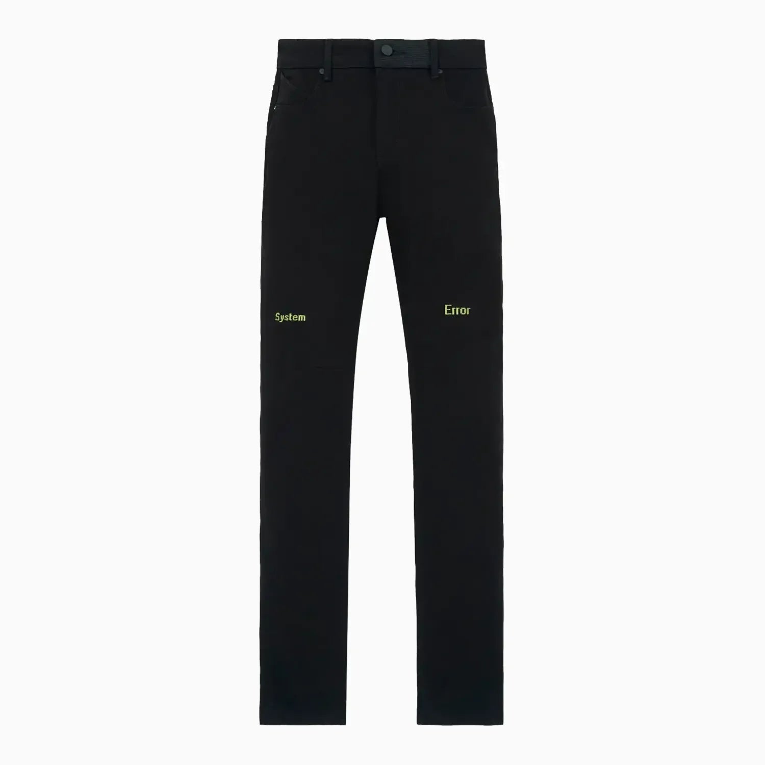 The Bryant Skinny Jean in Black Green Digital Cross is made from premium denim. Designed with a skinny fit and reinforced stitching on the inner thighs, these jeans feature the words "SYSTEM ERROR" in a digital style font above the knees, digitized RtA crosses down the back legs, the iconic RtA cross on the back pocket, and signature leather patch on the back waistband.