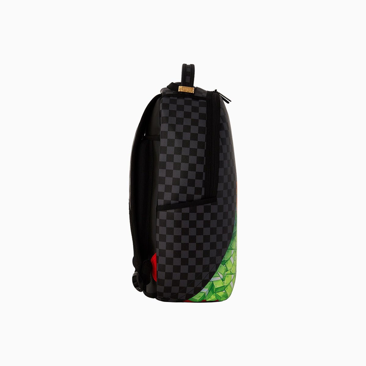 Dimensions: 18" x 6" x 11.5" • Front zipper pocket • Side pockets • Zippered Stash pocket • Separate velour sunglass compartment • Ergonomic mesh back padding • Adjustable Straps for custom sizing • Gold zippers with metal hardware • Metal "Sprayground Authentic" badge • Slide through back sleeve connects to carry-on luggage to free your hands